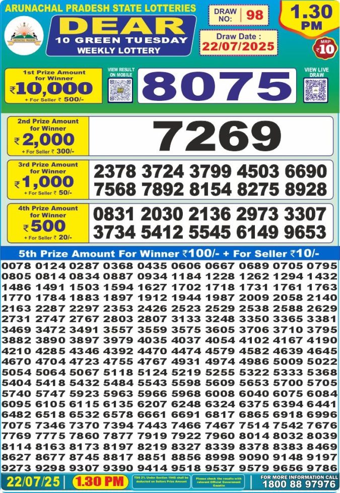Dear 10 Green 1.30PM Tuesday Weekly Lottery Result 22/07/2025