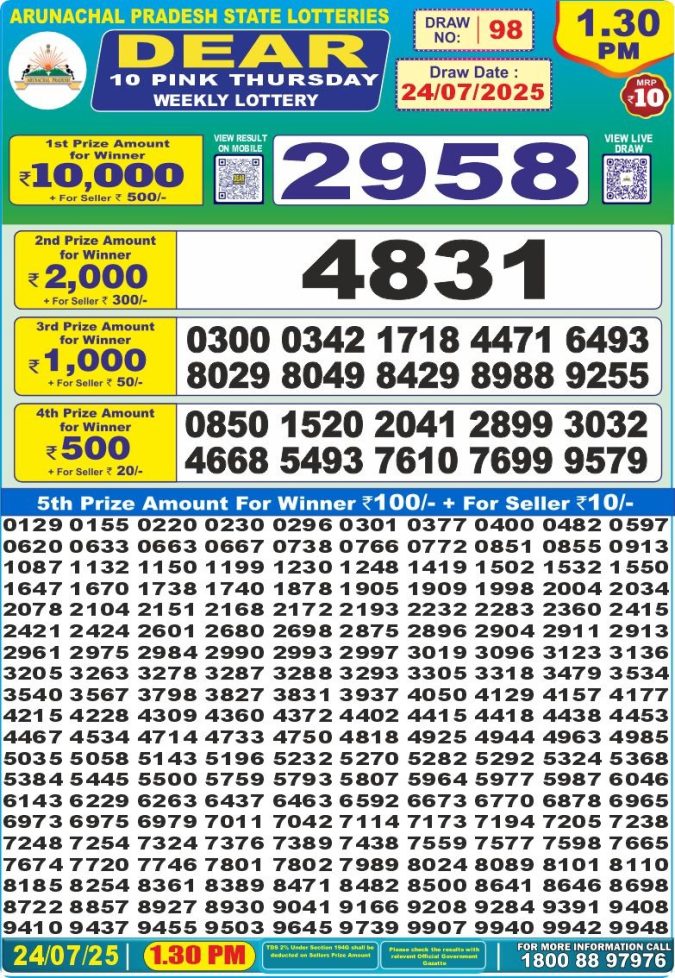 Dear 10 Pink 1.30PM Thursday Weekly Lottery Result 24/07/2025