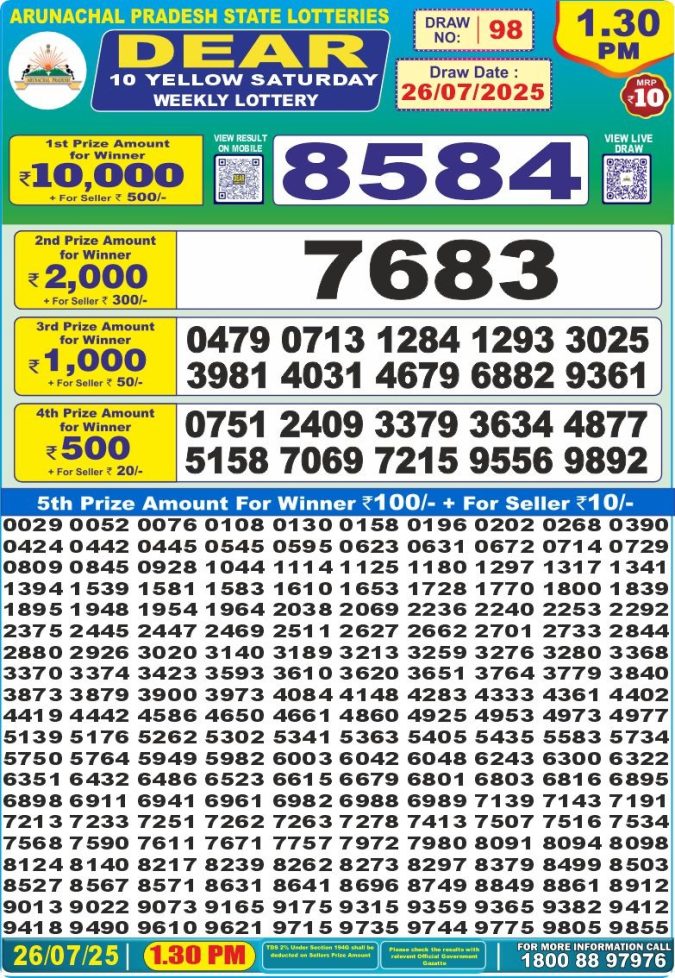 Dear 10 Yellow 1.30PM Saturday Weekly Lottery Result 26/07/2025