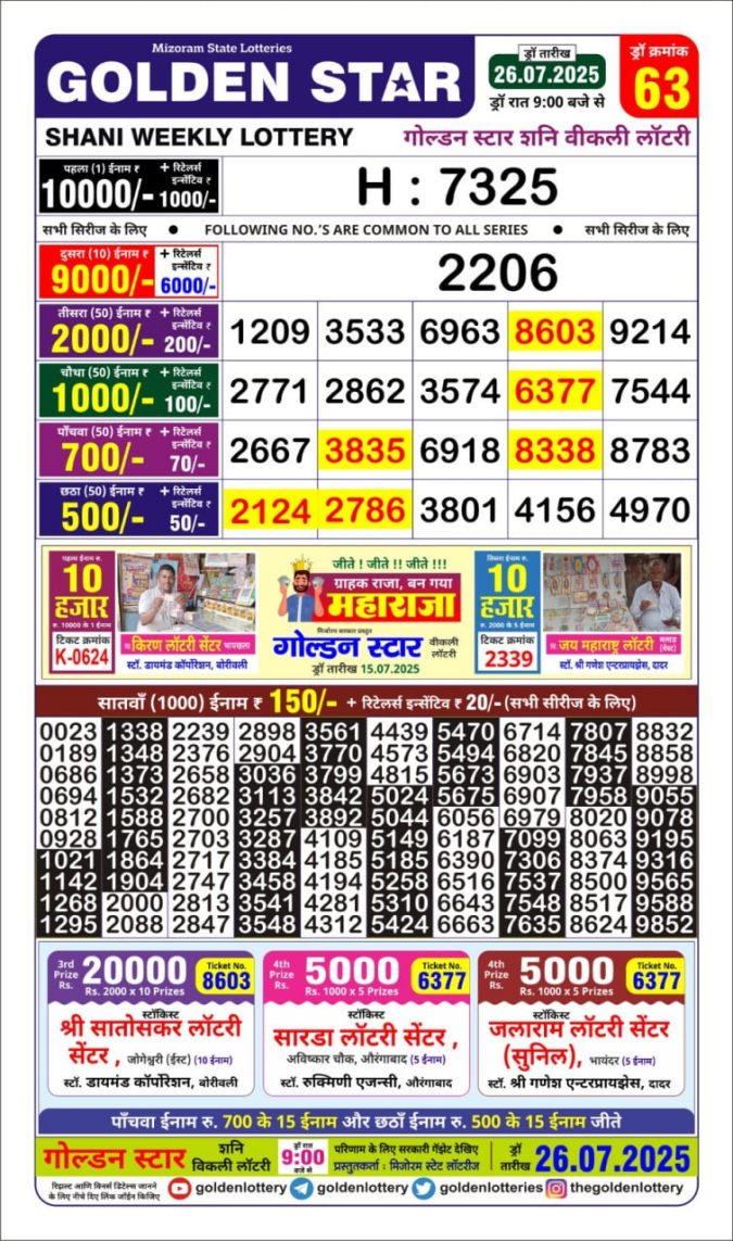 Golden Star Shani 9PM Weekly Lottery Result 26/07/2025