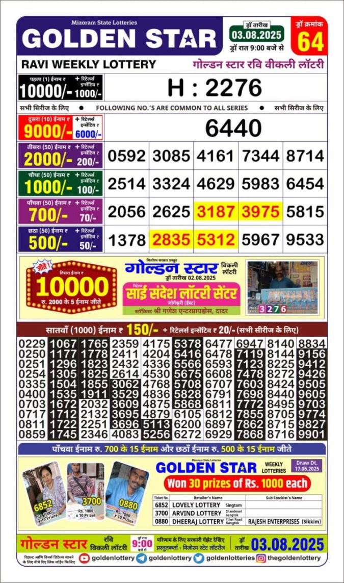 Golden Star Ravi 9pm Weekly Lottery Result 03/08/2025