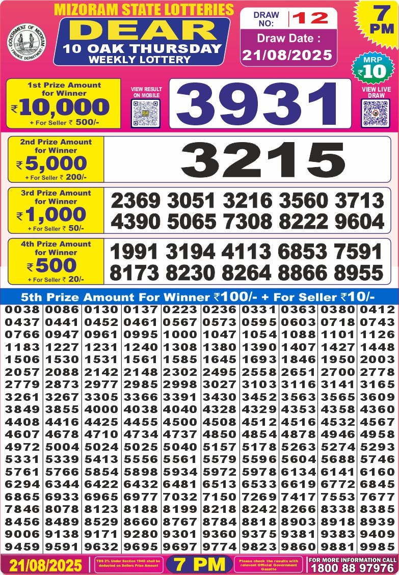 Dear 10 Oak 7pm Thursday Weekly Lottery Result 21/08/2025