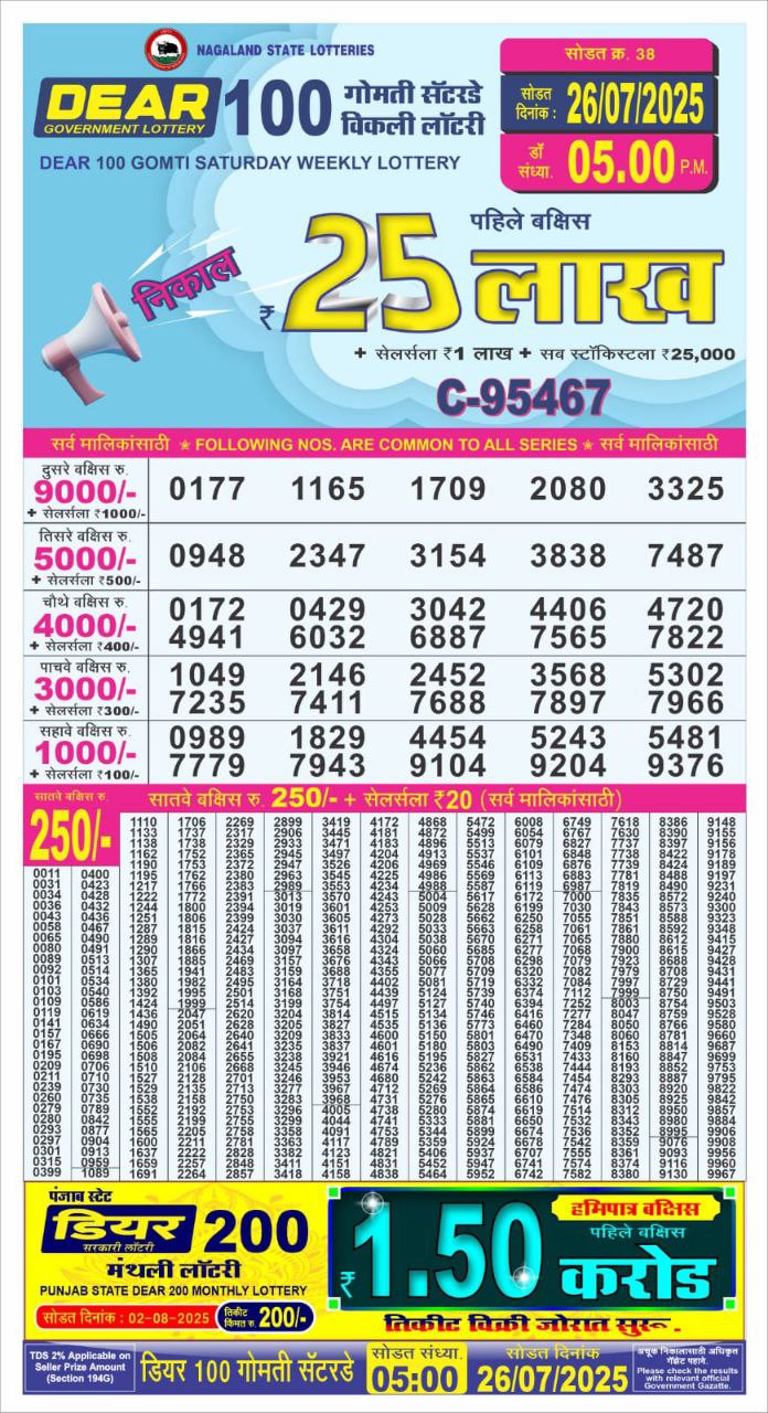 Dear 100 Gomti 5PM Saturday Weekly Lottery Result 26/07/2025
