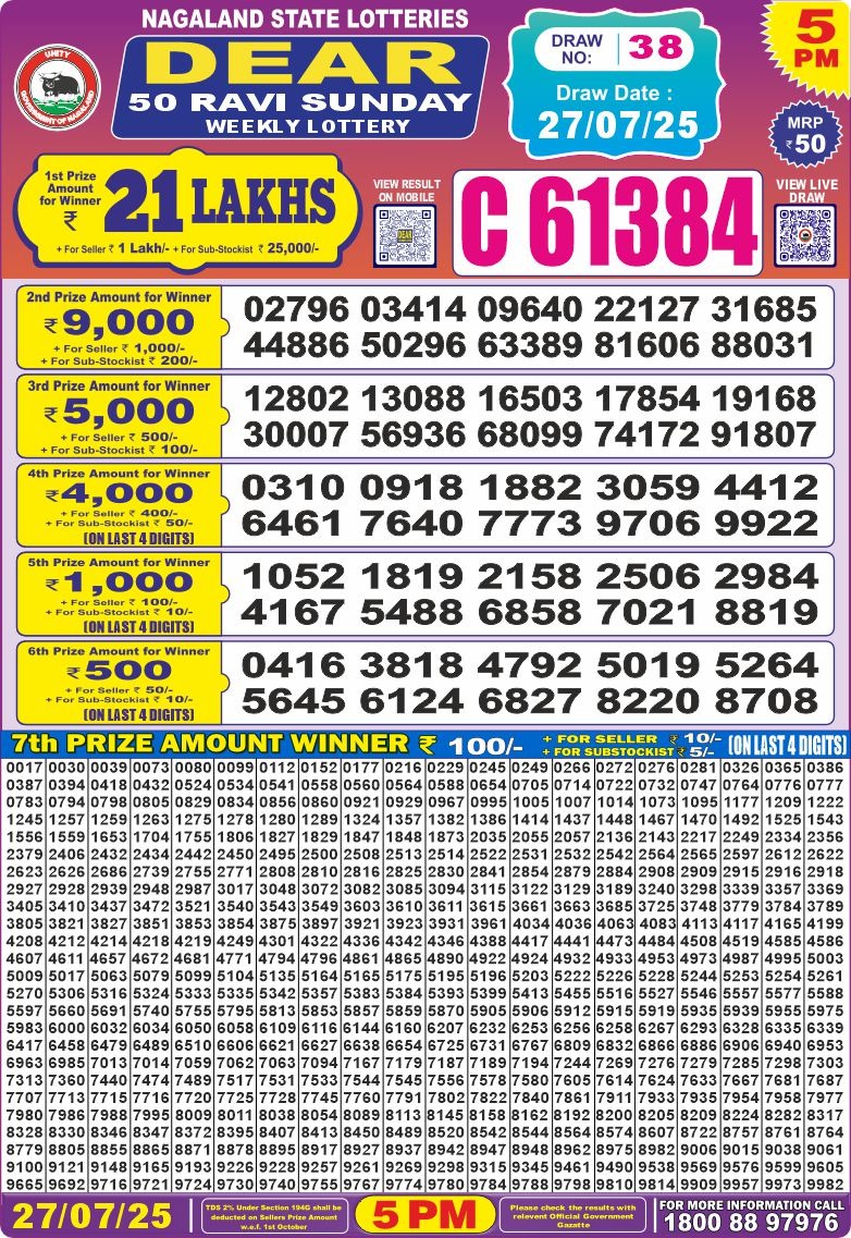 Dear 50 Ravi 5PM Sunday Weekly Lottery Result 27/07/2025 July 27, 2025 Leave a Comment on Dear 50 Ravi 5PM Sunday Weekly Lottery Result 27/07/2025 Related Results Dear 100 Gomti 5PM Saturday Weekly Lottery Result 26/07/2025 Dear 50 Satluj 5PM Friday Weekly Lottery Result 25/07/2025 Dear 100 Ganga 5PM Thursday Weekly Lottery Result 24/07/2025 Dear 50 Chenab 5PM Wednesday Weekly Lottery Result 23/07/2025