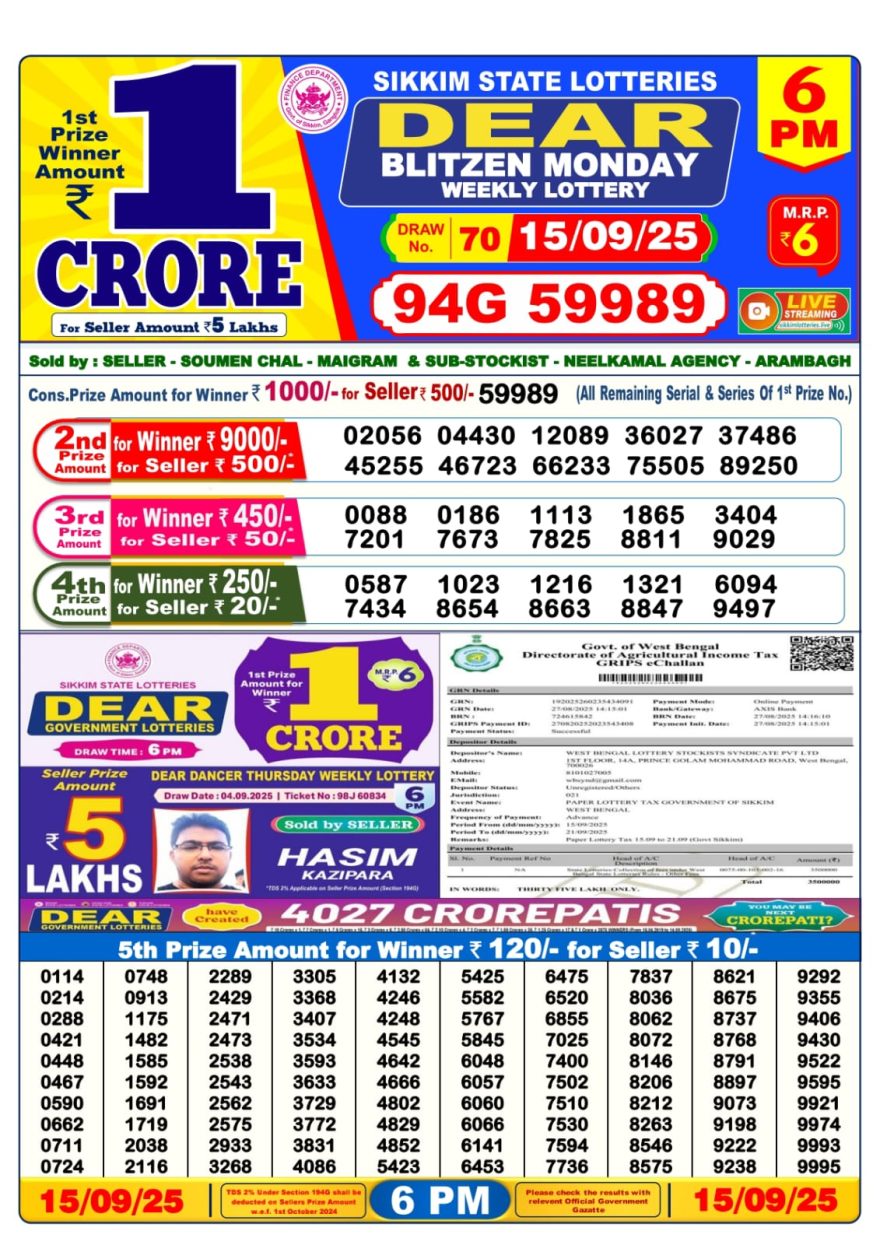Dear Blitzen 6pm Monday Weekly Lottery Result 15/09/2025