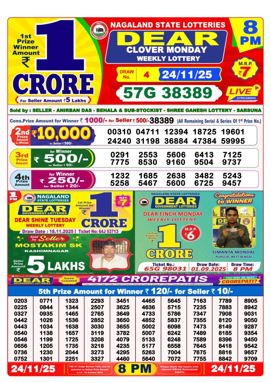 Dear Clover Monday Weekly Lottery Result 8pm 24/11/2025 November 24, 2025 Leave a Comment on Dear Clover Monday Weekly Lottery Result 8pm 24/11/2025 Related Results Dear Horizon 8pm Friday Weekly Lottery Result 05/12/2025 Dear Fame Thursday Weekly Lottery Result 8pm 04/12/2025 Dear Dream Wednesday Weekly Lottery Result 8pm 03/12/2025 Dear Destiny 8pm Tuesday Weekly Lottery Result 02/12/2025