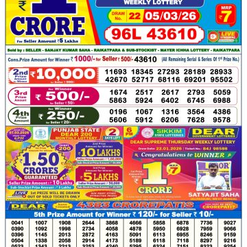 Dear Crown Friday Weekly Lottery Result 6pm 06/03/2026 March 6, 2026 Leave a Comment on Dear Crown Friday Weekly Lottery Result 6pm 06/03/2026 Related Results Dear Supreme Thursday Weekly Lottery Result 6pm 05/03/2026 Dear Regal 6pm Wednesday Weekly Lottery Result 04/03/2026 Dear Prestige 6pm Tuesday Weekly Lottery Result 03/03/2026 Dear Legend 6pm Monday Weekly Lottery Result 02/03/2026