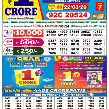 2026-03-23 Rajshree Night  Weekly Lottery Result 9pm 23/03/2026  2026-03-23 Rajshree 50 Som Weekly Lottery Result 7.30pm 23/03/2026  2026-03-23 Rajshree 8pm Monday Weekly Lottery Result 23/03/2026  2026-03-23 Dear Clover Monday Weekly Lottery Result 8pm 23/03/2026  2026-03-23 Golden Star Som 7PM Weekly Lottery Result Today 23/03/2026  2026-03-23 Dear Legend 6pm Monday Weekly Lottery Result 23/03/2026  2026-03-23 Rajshree 10 Evening Som Weekly Lottery Result 5.40pm 23/03/2026  2026-03-23 Punjab State Dear 50 5pm Monday Weekly Lottery Result 23/03/2026  2026-03-23 Labh Laxmi Bliss 4pm Monday Weekly Lottery Result 23/03/2026  2026-03-23 Rajshree Marigold 4pm Weekly Lottery Result 23/03/2026  2026-03-23 Rajshree Som 2.25pm Weekly Lottery Result 23/03/2026  2026-03-23 Dear Rise Monday Weekly Lottery Result 1pm 23/03/2026  2026-03-22 Kerala Lottery Result Samrudhi SM-47 Today 22/03/2026  2026-03-22 Rajshree Night  Weekly Lottery Result 9pm 22/03/2026  2026-03-22 Rajshree Sunday 8pm Weekly Lottery Result 22/03/2026  2026-03-22 Dear Magic Sunday Weekly Lottery Result 8pm 22/03/2026