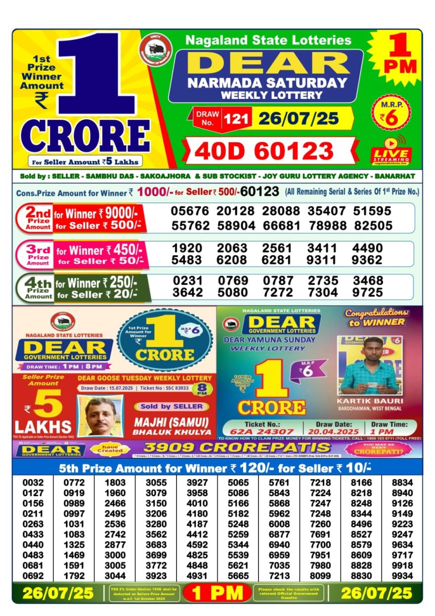 Dear Narmada 1PM Saturday Weekly Lottery Result 26/07/2025 July 26, 2025 Leave a Comment on Dear Narmada 1PM Saturday Weekly Lottery Result 26/07/2025 Related Results Dear Vision 1pm Saturday Weekly Lottery Result 13/12/2025 Dear Victory Friday Weekly Lottery Result 1pm 12/12/2025 Dear Star 1pm Thursday Weekly Lottery Result 11/12/2025 Rajshree Budh 1pm Weekly Lottery Result 10/12/2025