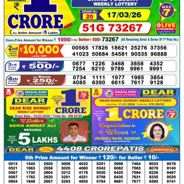 2026-03-19 Rajshree Night Weekly Lottery Result 9pm 19/03/2026  2026-03-19 Rajshree 50 Guru Weekly Lottery Result 7.30pm 19/03/2026  2026-03-19 Rajshree Thursday 8pm Weekly Lottery Result 19/03/2026  2026-03-19 Dear Fame Thursday Weekly Lottery Result 8pm 19/03/2026  2026-03-19 Dear Supreme Thursday Weekly Lottery Result 6pm 19/03/2026  2026-03-19 Golden Star Guru 7pm Weekly Lottery Result Today 19/03/2026  2026-03-19 Punjab State Dear 50 5pm Thursday Weekly Lottery Result 19/03/2026  2026-03-19 Rajshree 10 Evening Guru 5.40pm Weekly Lottery Result 19/03/2026  2026-03-19 Rajshree Lotus 4pm Weekly Lottery Result 19/03/2026  2026-03-19 Labh Laxmi Glad 4pm Thursday Weekly Lottery Result 19/03/2026  2026-03-19 Rajshree Guru 2.25pm Weekly Lottery Result 19/03/2026  2026-03-19 Dear Star 1pm Thursday Weekly Lottery Result 19/03/2026  2026-03-18 Golden 200 Monthly Lottery Result 18/03/2026  2026-03-18 Kerala Lottery Result Dhanalekshmi DL-44 Today 18/03/2026  2026-03-18 Rajshree Night Weekly Lottery Result 9pm 18/03/2026  2026-03-18 Rajshree 50 Budh 7.30pm Weekly Lottery Result 18/03/2026