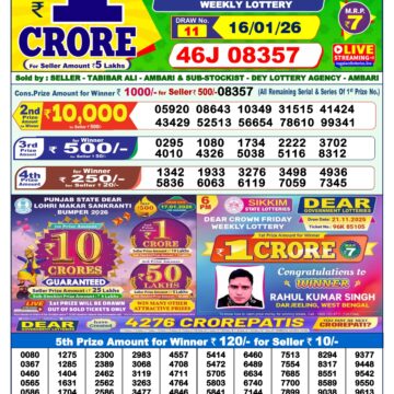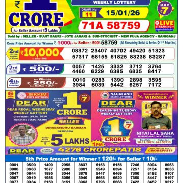 Dear Star 1pm Thursday Weekly Lottery Result 11/12/2025 December 11, 2025 Leave a Comment on Dear Star 1pm Thursday Weekly Lottery Result 11/12/2025 Related Results Dear Vision 1pm Saturday Weekly Lottery Result 17/01/2026 Dear Victory Friday Weekly Lottery Result 1pm 16/01/2026 Dear Star 1pm Thursday Weekly Lottery Result 15/01/2026 Rajshree Budh 1pm Weekly Lottery Result 14/01/2026