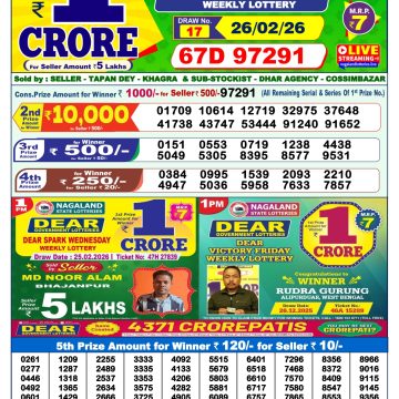 Dear Victory Friday Weekly Lottery Result 1pm 27/02/2026 February 27, 2026 Leave a Comment on Dear Victory Friday Weekly Lottery Result 1pm 27/02/2026 Related Results Dear Star 1pm Thursday Weekly Lottery Result 26/02/2026 Rajshree Budh 2.25pm Weekly Lottery Result 25/02/2026 Dear Spark 1pm Wednesday Weekly Lottery Result 25/02/2026 Dear Shine 1pm Tuesday Weekly Lottery Result 24/02/2026