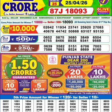 2026-04-25 Kerala Lottery Result Karunya KR-751 Today 25/04/2026  2026-04-25 Rajshree Night  Weekly Lottery Result 9pm 25/04/2026  2026-04-25 Rajshree 50 Shani Weekly Lottery Result 7.30pm 25/04/2026  2026-04-25 Rajshree Saturday 8pm Weekly Lottery Result 25/04/2026  2026-04-25 Dear Lucky 8pm Saturday Weekly Lottery Result 25/04/2026  2026-04-25 Golden Star Shani 8:30PM Weekly Lottery Result Today 25/04/2026  2026-04-25 Dear Elite 6pm Saturday Weekly Lottery Result 25/04/2026  2026-04-25 Punjab State Dear 50 5pm Saturday Weekly Lottery Result 25/04/2026  2026-04-25 Labh Laxmi Joy 4pm Saturday Weekly Lottery Result 25/04/2026  2026-04-25 Rajshree Orchid 4pm Weekly Lottery Result 25/04/2026  2026-04-25 Rajshree 10 Evening Shani 5.40pm Weekly Lottery Result 25/04/2026  2026-04-25 Rajshree Shani 2.25pm Weekly Lottery Result 25/04/2026  2026-04-25 Dear Vision 1pm Saturday Weekly Lottery Result 25/04/2026  2026-04-24 Kerala Lottery Result Suvarna Keralam SK-50 Today 24/04/2026  2026-04-24 Rajshree Night  Weekly Lottery Result 9pm 24/04/2026  2026-04-24 Rajshree 50 Shukra Weekly Lottery Result 7.30pm 24/04/2026