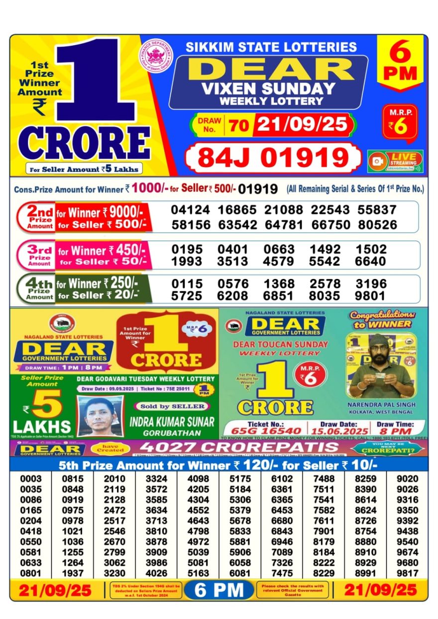 Dear Vixen 6pm Sunday Weekly Lottery Result 21/09/2025