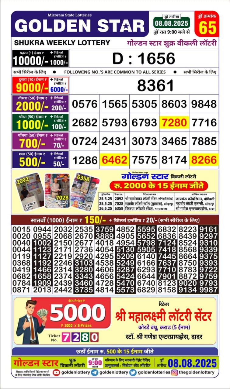 Golden Shukra 9pm Weekly Lottery Result 08/08/2025 August 8, 2025 Leave a Comment on Golden Shukra 9pm Weekly Lottery Result 08/08/2025 Related Results Golden Shukra 9pm Weekly Lottery Result 05/12/2025 Rajshree 250 Monthly Lottery Result 6.30PM 04/11/2025 Golden Shukra 9pm Weekly Lottery Result 28/11/2025 Golden 250 Monthly lottery Result 26/11/2025