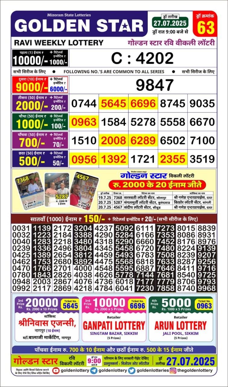 Golden Star Ravi 9PM Weekly Lottery Result 27/07/2025 July 27, 2025 Leave a Comment on Golden Star Ravi 9PM Weekly Lottery Result 27/07/2025 Related Results Golden Guru 9pm Weekly Lottery Result 04/12/2025 Golden 100 Monthly Lottery Result 03/12/2025 Golden Star 9 PM Weekly Lottery Result 02/12/2025 Golden Star Lottery Result Today 9pm 01/12/2025