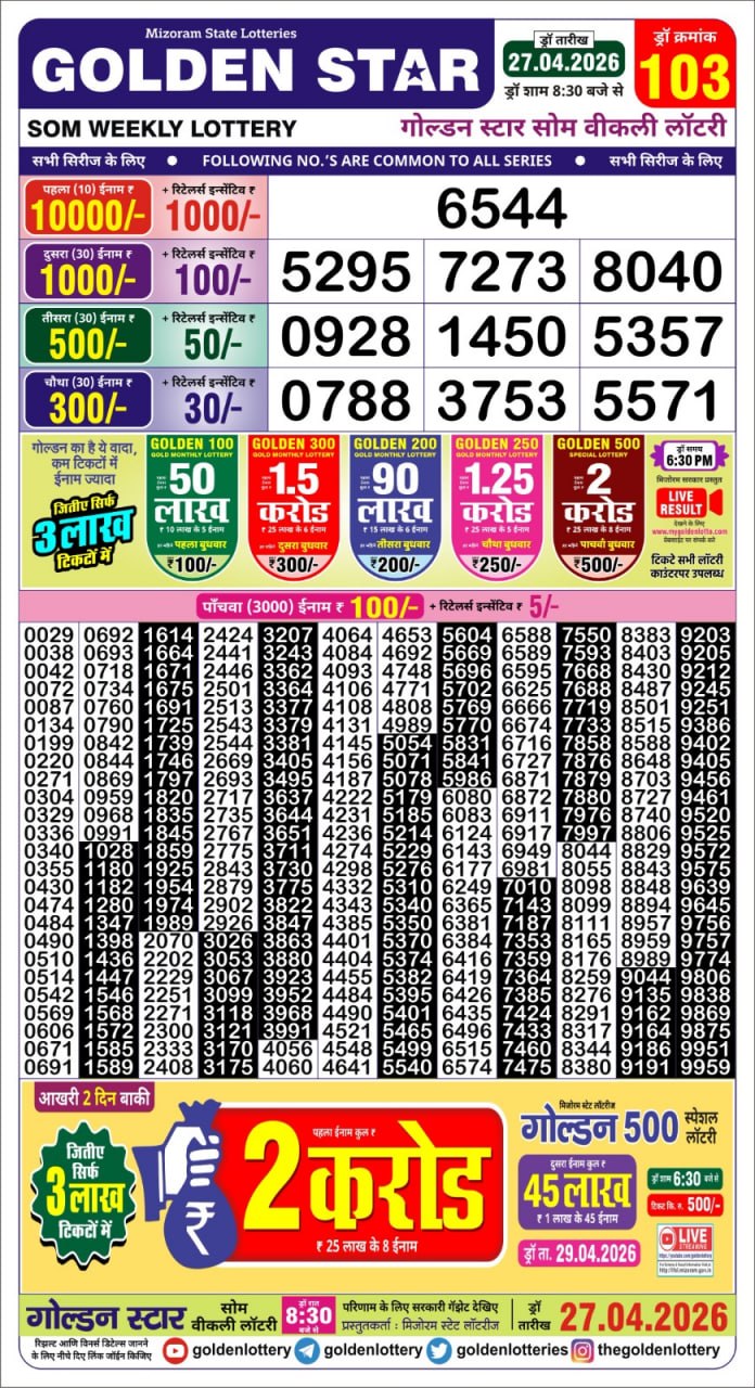 Golden Star Som 8:30PM Weekly Lottery Result Today 27/04/2026 April 27, 2026 Leave a Comment on Golden Star Som 8:30PM Weekly Lottery Result Today 27/04/2026 Related Results Golden Star Ravi 8:30PM Weekly Lottery Result Today 26/04/2026 Golden Star Shani 8:30PM Weekly Lottery Result Today 25/04/2026 Golden Star Shukra 8:30PM Weekly Lottery Result Today 24/04/2026 Golden Star Guru 8:30PM Weekly Lottery Result Today 23/04/2026