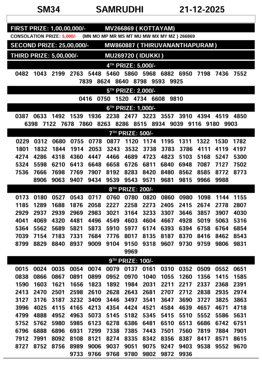 Kerala Lottery Result Samrudhi SM-34 Today 21/12/2025