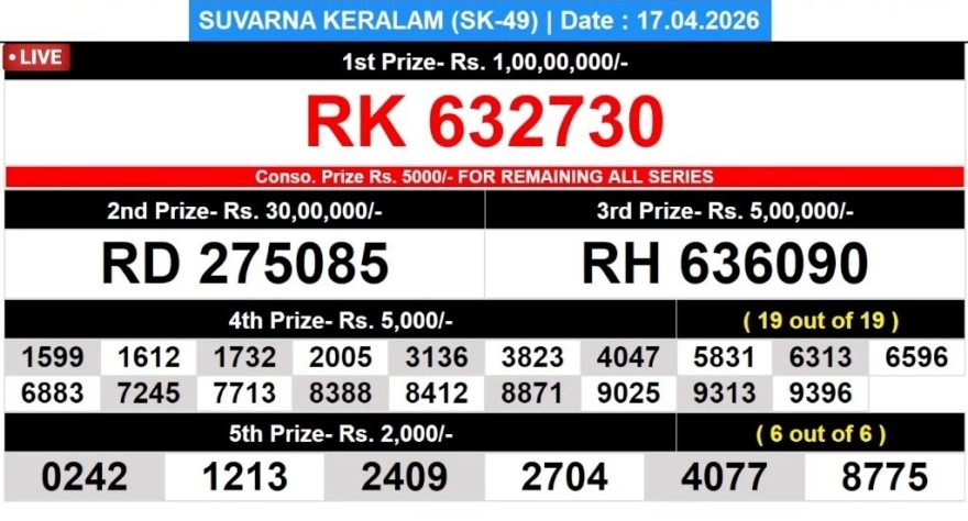 April 17, 2026  Leave a Comment on Kerala Lottery Result Suvarna Keralam SK-49 Today 17/04/2026