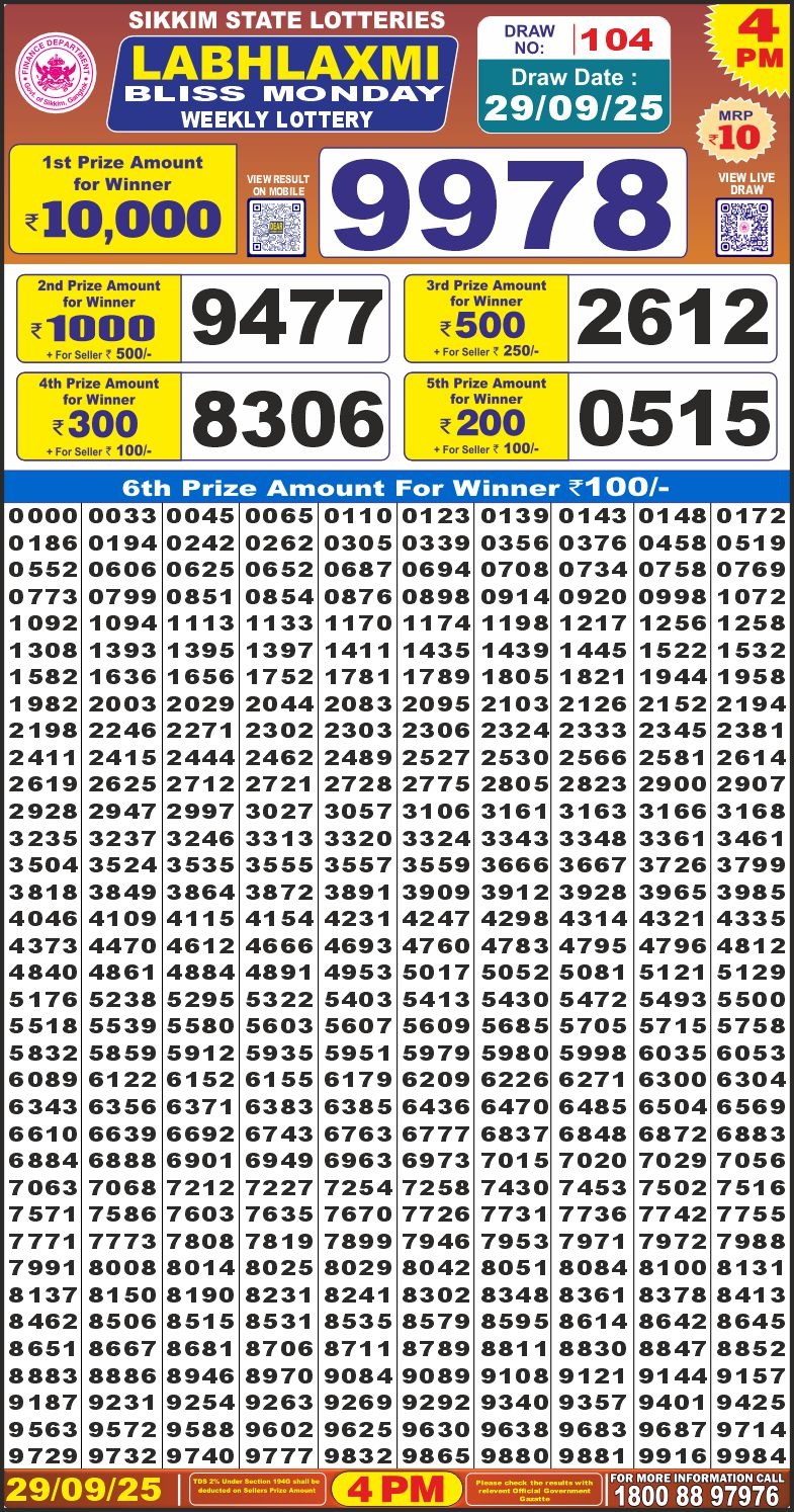 Labh Laxmi Bliss 4pm Monday Weekly Lottery Result 29/09/2025 September 29, 2025 Leave a Comment on Labh Laxmi Bliss 4pm Monday Weekly Lottery Result 29/09/2025 Related Results Labh Laxmi Joy 4pm Saturday Weekly Lottery Result 06/12/2025 Labh Laxmi Glow Friday Weekly Lottery Result 4pm 05/12/2025 Labh Laxmi Glad 4pm Thursday Weekly Lottery Result 04/12/2025 Labh Laxmi Delight 4pm Wednesday Weekly Lottery Result 03/12/2025