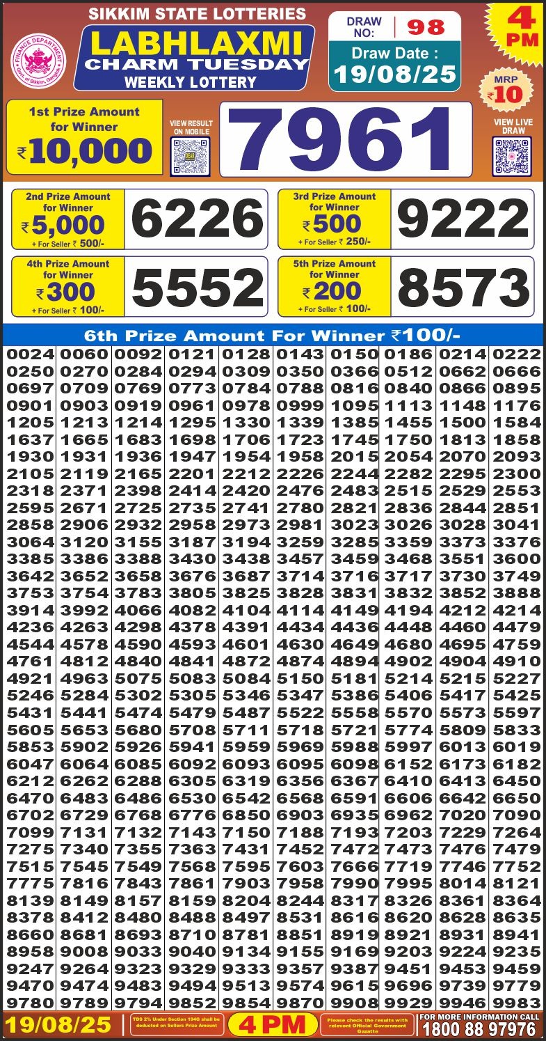 August 19, 2025  Leave a Comment on Labh Laxmi Charm 4pm Tuesday Weekly Lottery Result 19/08/2025