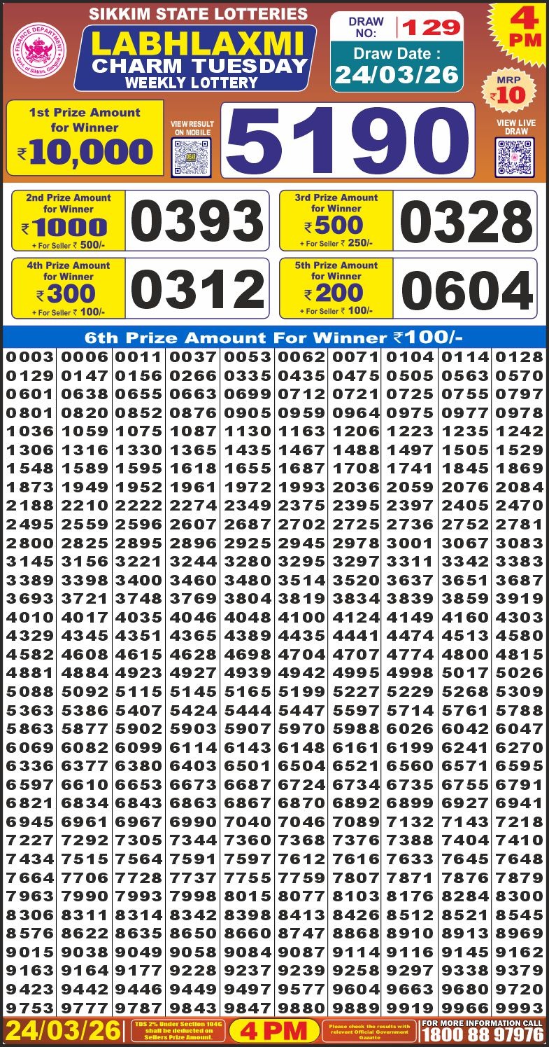 Labh Laxmi Charm 4pm Tuesday Weekly Lottery Result 24/03/2026 March 24, 2026 Leave a Comment on Labh Laxmi Charm 4pm Tuesday Weekly Lottery Result 24/03/2026 Related Results Labh Laxmi Power 4pm Sunday Weekly Lottery Result 19/04/2026 Labh Laxmi Joy 4pm Saturday Weekly Lottery Result 18/04/2026 Labh Laxmi Glow Friday Weekly Lottery Result 4pm 17/04/2026 Labh Laxmi Glad 4pm Thursday Weekly Lottery Result 16/04/2026