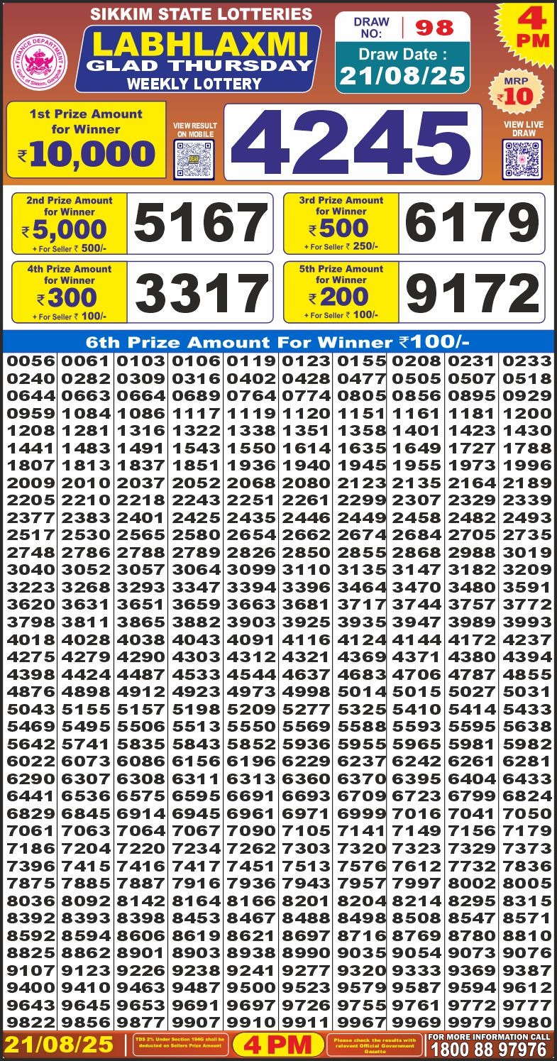 Labh Laxmi Glad 4pm Thursday Weekly Lottery Result 21/08/2025 August 21, 2025 Leave a Comment on Labh Laxmi Glad 4pm Thursday Weekly Lottery Result 21/08/2025 Related Results Labh Laxmi Glow Friday Weekly Lottery Result 4pm 05/12/2025 Labh Laxmi Glad 4pm Thursday Weekly Lottery Result 04/12/2025 Labh Laxmi Delight 4pm Wednesday Weekly Lottery Result 03/12/2025 Labh Laxmi Charm 4pm Tuesday Weekly Lottery Result 02/12/2025