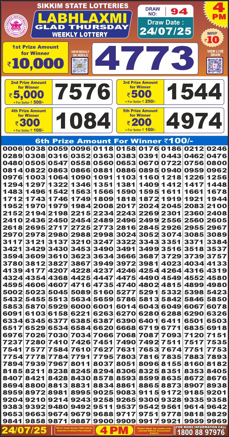 Labh Laxmi Glad 4PM Thursday Weekly Lottery Result 24/07/2025