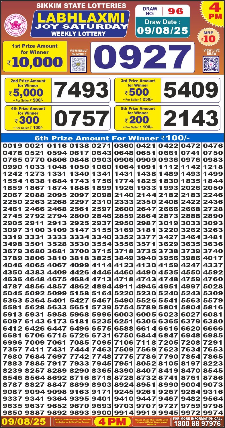 Labh Laxmi Joy 4pm Saturday Weekly Lottery Result 09/08/2025 August 9, 2025 Leave a Comment on Labh Laxmi Joy 4pm Saturday Weekly Lottery Result 09/08/2025 Related Results Labh Laxmi Joy 4pm Saturday Weekly Lottery Result 06/12/2025 Labh Laxmi Glow Friday Weekly Lottery Result 4pm 05/12/2025 Labh Laxmi Glad 4pm Thursday Weekly Lottery Result 04/12/2025 Labh Laxmi Delight 4pm Wednesday Weekly Lottery Result 03/12/2025