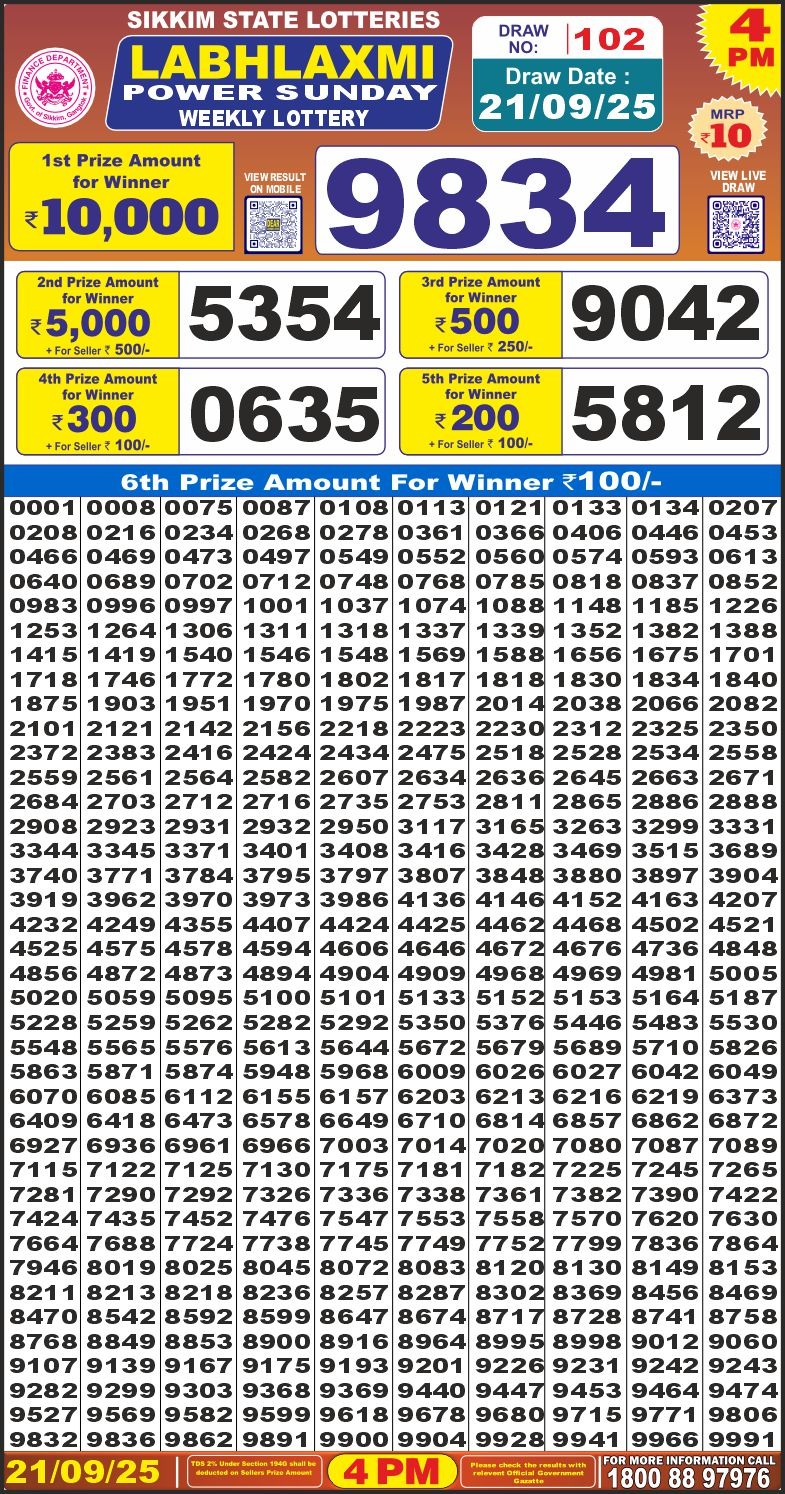 Labh Laxmi Power 4pm Sunday Weekly Lottery Result 21/09/2025 September 21, 2025 Leave a Comment on Labh Laxmi Power 4pm Sunday Weekly Lottery Result 21/09/2025 Related Results Labh Laxmi Glow Friday Weekly Lottery Result 4pm 05/12/2025 Labh Laxmi Glad 4pm Thursday Weekly Lottery Result 04/12/2025 Labh Laxmi Delight 4pm Wednesday Weekly Lottery Result 03/12/2025 Labh Laxmi Charm 4pm Tuesday Weekly Lottery Result 02/12/2025
