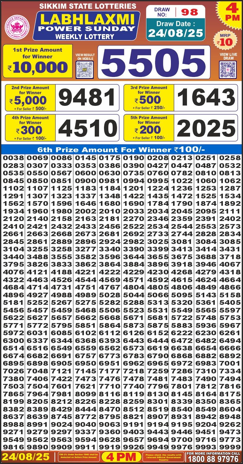 Labh Laxmi Power 4pm Sunday Weekly Lottery Result 24/08/2025 August 24, 2025 Leave a Comment on Labh Laxmi Power 4pm Sunday Weekly Lottery Result 24/08/2025 Related Results Labh Laxmi Glow Friday Weekly Lottery Result 4pm 05/12/2025 Labh Laxmi Glad 4pm Thursday Weekly Lottery Result 04/12/2025 Labh Laxmi Delight 4pm Wednesday Weekly Lottery Result 03/12/2025 Labh Laxmi Charm 4pm Tuesday Weekly Lottery Result 02/12/2025