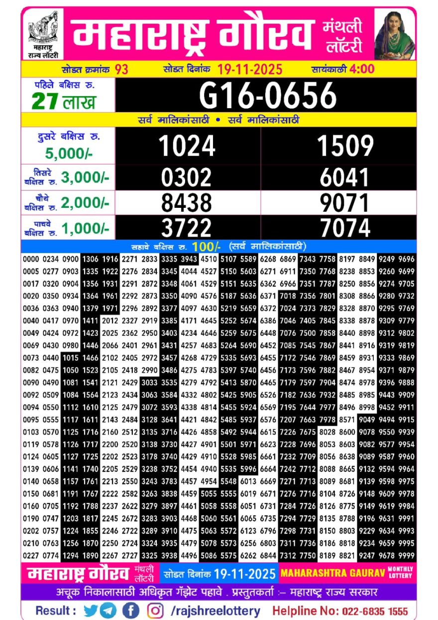 MAHARASHTRA GAURAV MONTHLY LOTTERY RESULT 19/11/25 November 19, 2025 Leave a Comment on MAHARASHTRA GAURAV MONTHLY LOTTERY RESULT 19/11/25 Related Results Golden Shukra 9pm Weekly Lottery Result 05/12/2025 Rajshree 250 Monthly Lottery Result 6.30PM 04/11/2025 Golden Shukra 9pm Weekly Lottery Result 28/11/2025 Golden 250 Monthly lottery Result 26/11/2025