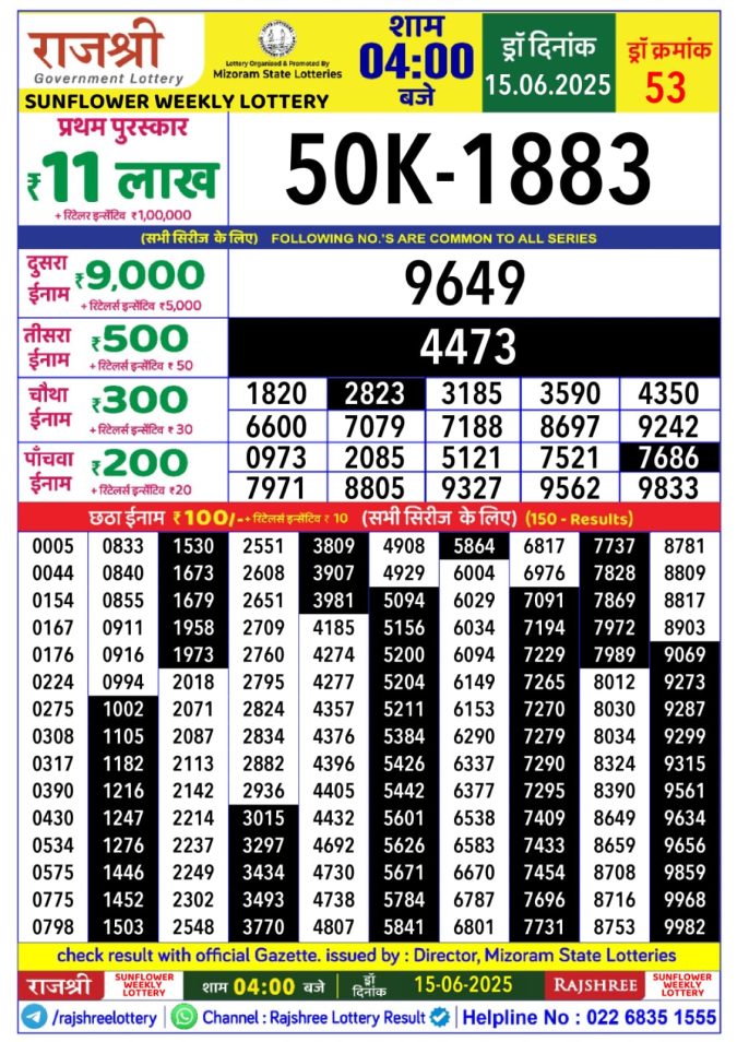 Rajshree sunflower 4pm weekly lottery result 15/06/2025
