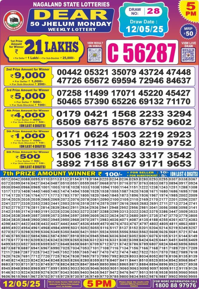 Dear 50 jhelum 5pm Monday weekly lottery result 12/05/2025