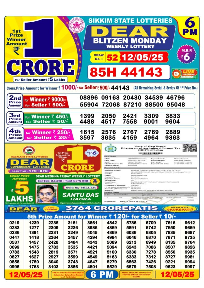 Punjab state dear 10 6pm Monday weekly lottery result 12/05/2025