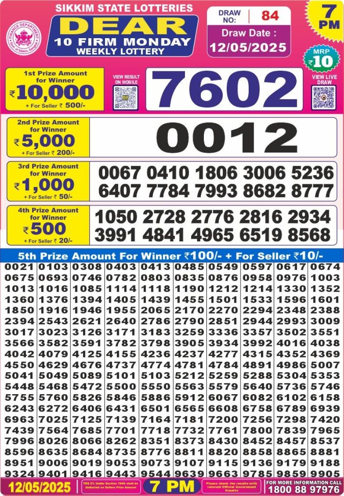 Dear 10 firm 7pm Monday weekly lottery result 12/05/2025