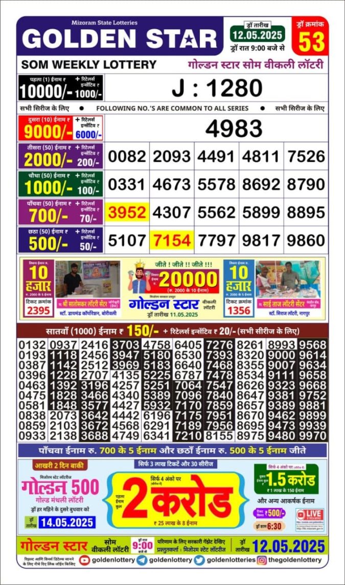 Rajshree som 1pm weekly lottery result 12/05/2025
