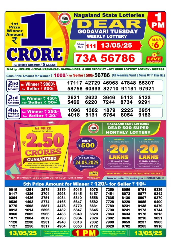 Dear Godavari 1pm  Tuesday weekly lottery result 13/05/2025