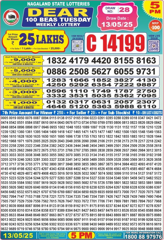 Dear 100 beas 5pm Tuesday weekly lottery result 13/05/2025