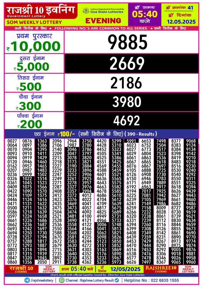 Rajshree 10 evening som 5.40 lottery result 12/05/2025