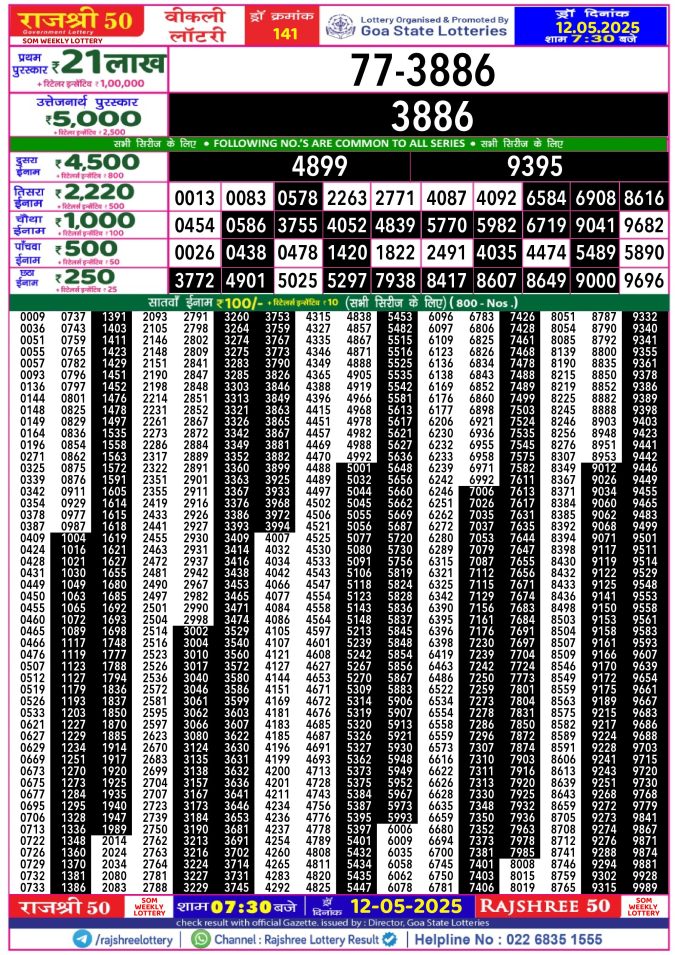Rajshree 50 som 7.30pm  weekly lottery result 12/05/25
