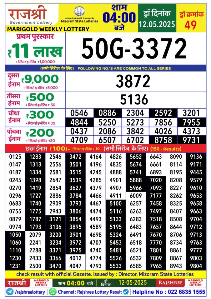 Rajshree Marigold  4pm weekly lottery result 12/05/2025