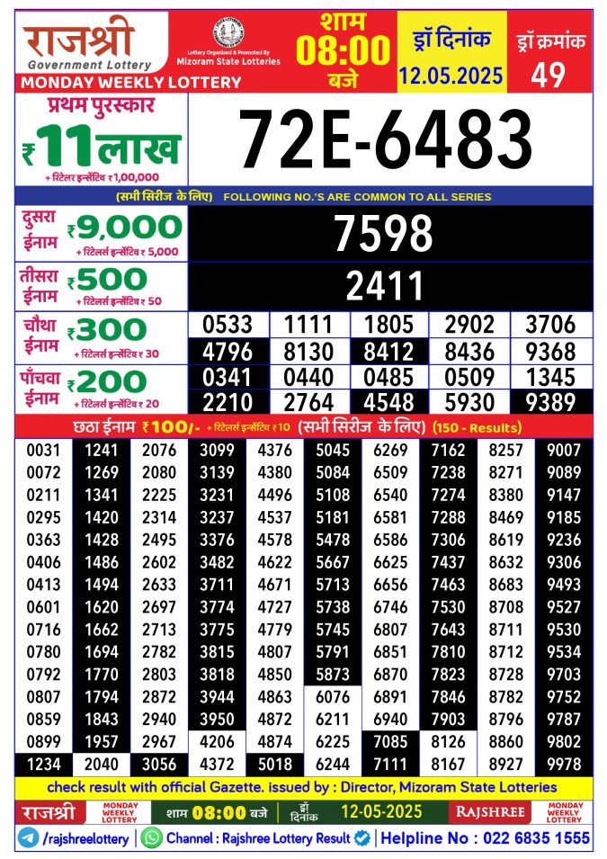 Rajshree 30 som 8.30 weekly lottery result 12/05/2025