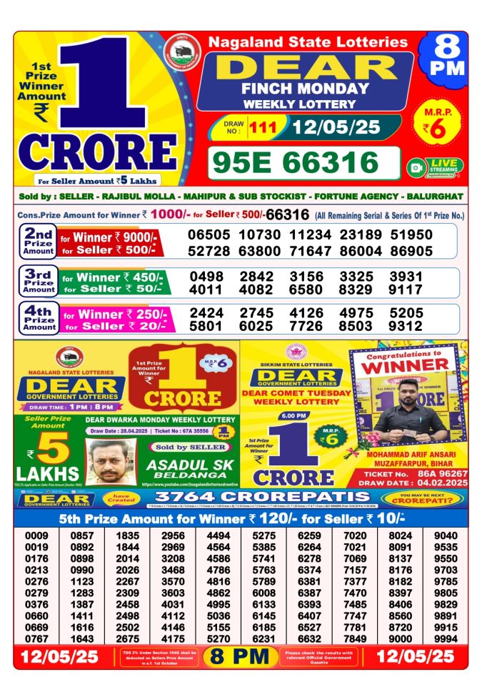 Dear dwarka 1pm Monday weekly lottery result 12/05/2025