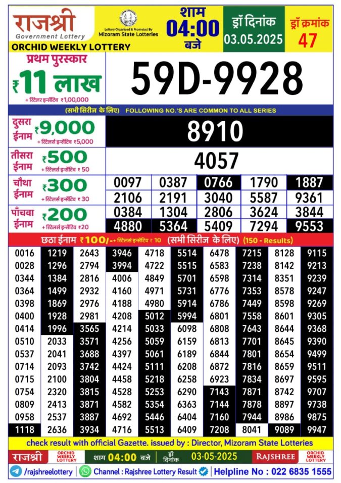Rajshree orchid 4pm weekly lottery result 3/05/2025