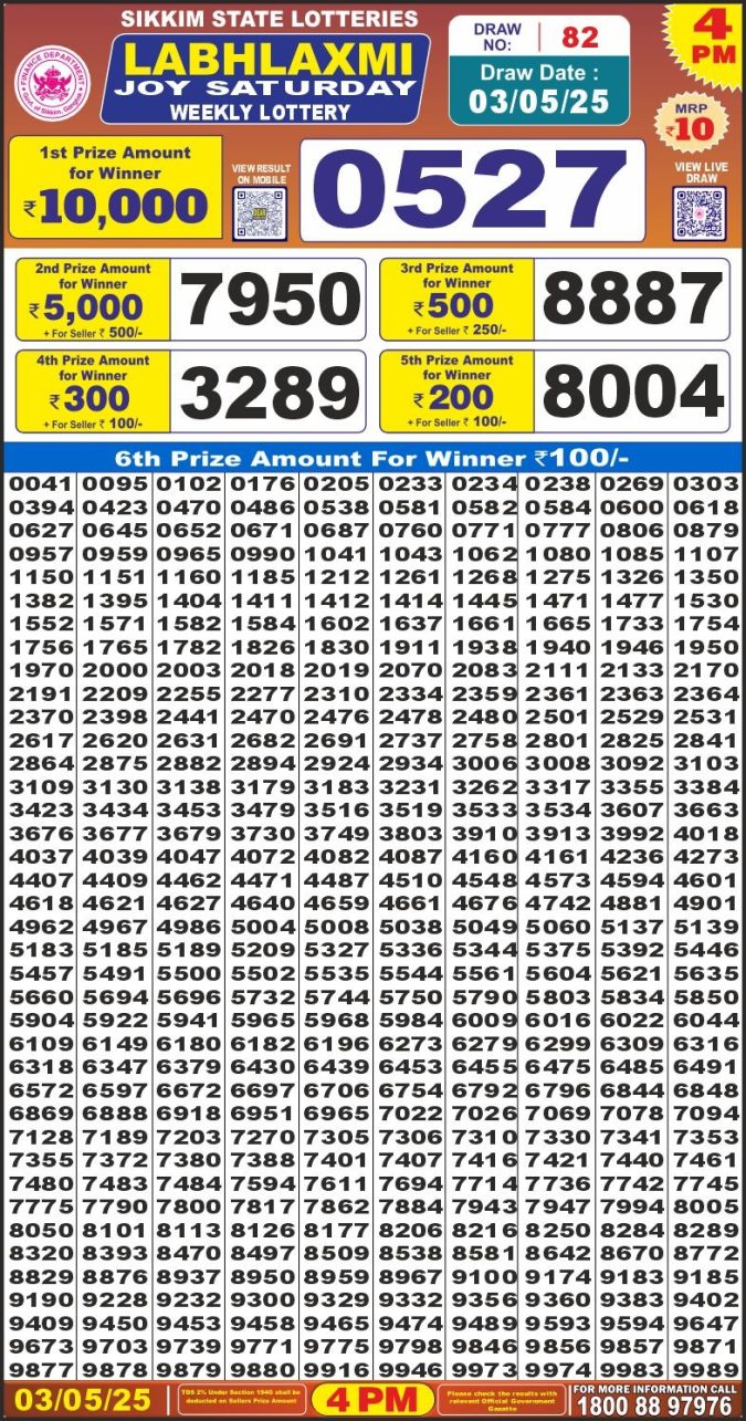 Labh laxmi joy 4pm Saturday weekly lottery result 3/05/2025