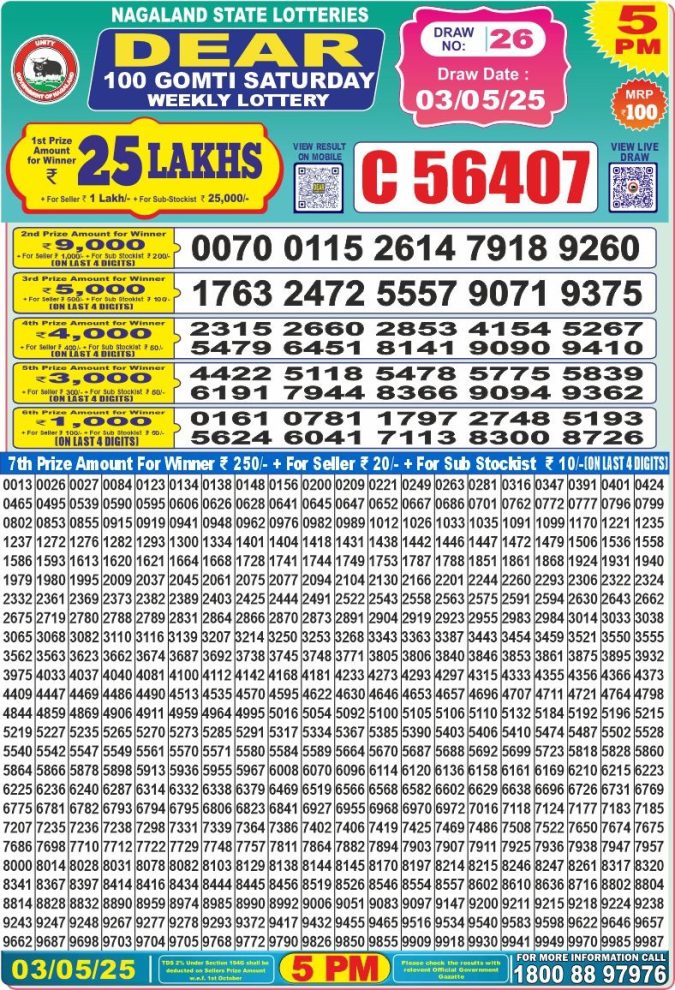 Dear 100 Gomti 5pm saturday weekly lottery result 3/05/2025