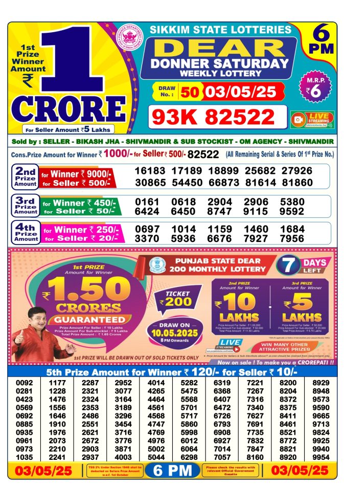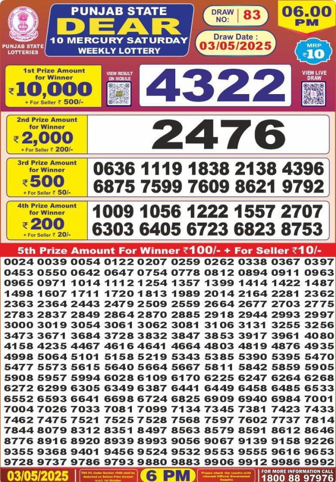 Punjab state dear10  6pm saturday weekly lottery result 3/05/2025