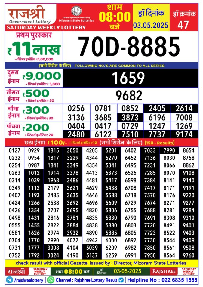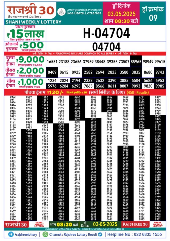 Rajshree shani 1pm Weekly lottery result 3/05/2025