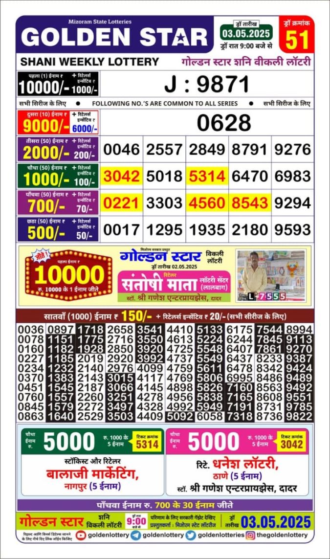 Golden star shani 9pm weekly lottery result 3/05/2025